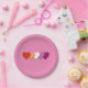 Paper plates with hearts in colours of lesbian pride flag, pride design on a pink background; orange, white, and pink hearts