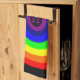 This awesome kitchen towel is designed for lesbians. It features a round rainbow with two little pink female symbols, standing side by side in the centre of the rainbow.