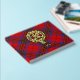Clan Leslie crest badge surrounded by a strap and buckle over red tartan background. Custom front, back and spine text.