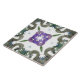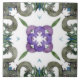 A arabesque design in green, blue and purple in the style of spanish azulejo tiles.