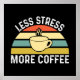 Anyone who loves coffee and knows the effect it has on their stress level will love this retro style coffee design on bags, mugs, stickers, T-shirts, pillows, and more featuring a steaming cup of coffee design with text that reads Less Stress More Coffee!