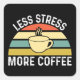 Anyone who loves coffee and knows the effect it has on their stress level will love this retro style coffee design on bags, mugs, stickers, T-shirts, pillows, and more featuring a steaming cup of coffee design with text that reads Less Stress More Coffee!