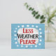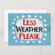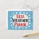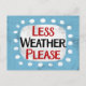 "Less Weather Please" is a cute text design in blue with black and red text, along with a white accent shape and white textured whimsical dots surrounding it.