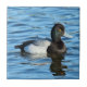 A lesser scaup drake duck is depicted in this winter scene. The lesser scaup drake is recognised by its light blue bill and iridescent head that may appear greenish or purple . Also known as bluebill by waterfowl hunters, this species is often found together with redheads and canvasbacks.