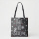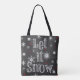 Black and white faux chalkboard look tote bag with white snowflakes, red dots and white chalk look "Let it Snow" wording.