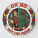 This image features a circular wall clock with a humorous, non-traditional Christmas theme. The central illustration shows an angry-looking elf peering out from a partially opened green door, holding an antique lantern. The clock face is surrounded by a white ring containing the black hour markers and clock hands. The border features festive greenery, poinsettias, candy canes, and large red and gold ornaments. Humorous red text is boldly displayed at the top and bottom: "OH NO" (at the top) and "NOT YOU AGAIN" (at the bottom).