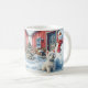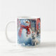 Charming Snowman and his Westie with a red barn on a snowy day; this snowy winter mug will make cold days a lot warmer. This is a mug you'll use from the first snow to the last. Dishwasher and microwave safe.