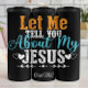 This inviting design states "Let Me TELL YOU About My JESUS." "Let Me" is in distressed orange, "TELL YOU" is smaller and black, and "About My" flows in a beautiful blue script. "JESUS" is prominent in bold white with hearts, creating a warm invitation to share faith.