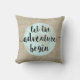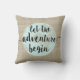 "Let the adventure begin" with this lovely pillow design of the world with hand-lettered looking typography set against a softly coloured earth and set on a faux burlap, linen look background. Perfect for the travel lover, adventurer, or as a bon voyage gift.