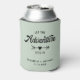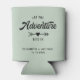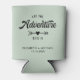 Give a wedding toast and a fun souvenir keepsake gift to your wedding guests with this custom sage green can cooler featuring "Let The Adventure Begin" written in a mix of simple typography and a retro script, a heart with an arrow, and your names and wedding date.