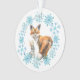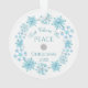 On this Holiday ornament, a pretty ice blue snowflake wreath frames watercolor images of a red fox and little bunny rabbit. The back of the ornament has the same blue wreath with the text in matching blue "Let there be PEACE". Two more text fields are for your customisation, with a silver snowflake serving at the middle as a divider.