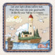 A lighthouse with the verse from the Bible, "Let your light shine before men, that they may see your good works & glorify your Father in heaven."