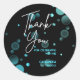A modern, stylish and glamourous thank-you sticker. This design features a vibrant typography "Thank You" with blue gradient bokeh on a black background. Personalise it with your text.