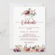 This let's celebrate rustic summer floral party invitation is perfect for a simple engagement party, bachelorette party, retirement, graduation, wedding after party or any event or party. The design features burgundy, pink and blush watercolor flowers with green leaves in a brownish stained background.