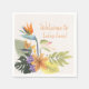 Tropical napkins to personalise or not, the bouquet is also a clear image on a pebble fleck background for viewing purposes, but which colour you can easily change. These napkins have coordinates for paper partying, decorated with Birds-of-Paradise, Anthurium, an unidentified deep lavender flower, and contrasting tropical broad leaves