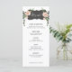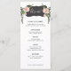 This desert bloom menu features pink blossoms and greenery on either side of a curvy black box with the word "Let's Eat." There is space for 5 course. All the menu details can be edited. Colours include green, pink, white and black. The bride and grooms name are featured on the back.