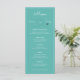 This menu features a plane and a heart shaped trail around the bride and grooms name. There is space for 5 courses. All the menu details can be edited. Colours include aqua, pink, white and black.
