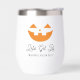 Personalise these spooky wine tumblers to create a perfect Halloween party favour. Design features a smiling orange jack o'lantern face with two lines of custom text beneath; shown with "let's get lit" and your Halloween party name and year.