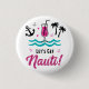 This playful button is perfect for your nautical-themed bachelorette bash! With pink glitter text and beachy elements, it’s a cute accessory for the whole bride crew. Pin it to bags, shirts, or party favours!