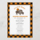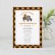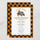 Thanksgiving menu featuring illustration of a buffalo bison with pumpkin on its back. Border and reverse are orange and black buffalo plaid.