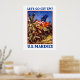 This vintage World War Two poster features marines fighting in the jungle, the Marine Corps Flag, and the US Flag. It reads, "Let's go get 'em! U.S. Marines". Celebrate Marine Corps and WW2 History with this digitally restored vintage war poster product from The War Is Hell Store.