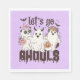 Cute and witty Halloween design on T-shirts, mugs, bags, pillows, buttons, and more features three funny Halloween ghouls with devil horns and witch hats, bats, flowers, jack o lantern pumpkin, and text that reads Let's Go Ghouls!