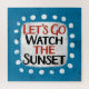 "Let's Go Watch The Sunset" is a cute text design in light blue with black and red text, along with a white accent shape and white textured whimsical dots surrounding it.