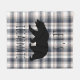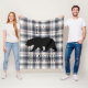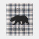 Cute "let's hibearnate" typography fleece blanket featuring a black bear silhouette over a rustic cream and grey plaid background.
