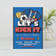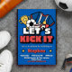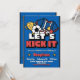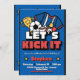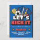 Kick off the fun with this sporty soccer-themed birthday invitation! Perfect for your little one’s 1st birthday celebration, this playful design features a soccer ball, jersey, trophy, and bold comic-style lettering that says “Let’s Kick It.”