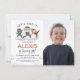 Gear up for an action-packed celebration with our ninja-themed birthday party invitation. This dynamic design showcases a captivating watercolor illustration of three little ninjas, each striking their favourite martial arts pose, emerging from a burst of smoke, or floating on a cloud. Customise the invitation by adding a custom photo of the birthday boy on the right-hand side. The playful phrase "Let's Kick It!" above the ninjas combines the concept of hanging out with the world of martial arts. The invitation calls all ninjas to join in the celebration, with the birthday boy's name in bold red letters and age in fun blue script. The event details are presented in clean and simple typography, with ninja stars framing the important information of date and time. Flip the card to reveal a pattern of clouds and ninja star weapons. Perfect for ages 4 to 10, this energetic design sets the tone for an exciting and memorable birthday party that promises action, adventure, and loads of fun. Customise this invitation to reflect your party's specific details. Feel free to message me with any questions, just please note that I cannot modify an existing order. Browse our collection for more boy birthday invitations!