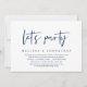 Modern Navy Blue Script themed, wedding elopement invitation card (Let's party). It is perfect for your wedding elopement casual lakeside wedding dinner, dancing and party.