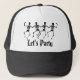 Halloween trucker hat shown in black and white with a cute dancing skeletons print. Buy as is or customise.