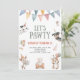 This birthday party invitation features "let's pawty" and lots of dogs to invite friends and family to a birthday party for your dog-loving little one.