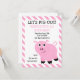Let's Pig Out Piggy Birthday Party Invitation. Personalise this cute pink piggy party invite for your pig or barnyard themed birthday party. Cute pink cartoon pig in black and pink. Car is trimmed in pink and white stripes. Edit information for time, place and rsvp info for children's pig party. Kids party supplies. www.SamAnnDesigns.com
