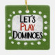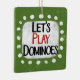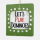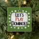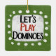 "Let's Play Dominoes" is a cute text design with a white accent shape surrounded by white textured whimsical dots.
