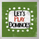 "Let's Play Dominoes" is a cute text design with a white accent shape surrounded by white textured whimsical dots.