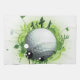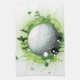 Grunge style shades of green, golf design, featuring an in your face golf ball with splats and leaves around it and golfers with golf bags in hand, standing on the surface of the golf ball, with golf flags sticking out.