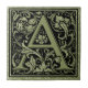 Charming decorative letter A initial monogram calligraphy style typography first letter in black over vintage avocado green book lining with off white Ginkgo biloba leaves.