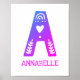 Colourful Letter A whimsical lettering embellished with doodle heart, dot rainbow and compound leaves. Bright graident colouring in blue, purple and pink. Personalise with a custom name in matching pink font.