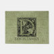 Charming decorative letter D initial monogram calligraphy style typography first letter in black over vintage sage green book lining with off white Ginkgo biloba leaves.