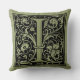 Charming letter I initial monogram calligraphy William Morris style typography first letter in black over vintage sage green - avocado green book lining with off white Ginkgo biloba leaves.