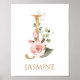 Elegant Letter I monogram nursery poster featuring watercolor pink rose and green foliage.