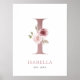 Pink floral nursery poster with letter I monogram. Elegant and feminine letter I monogram poster with delicate watercolor flowers. This will be a perfect personalized accent for nurseries, bedrooms and other spaces. With space to put the name and date.