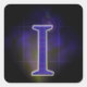 Stickers met de letter I. (bijvoorbeeld je initiaal) Leuk als je naam met de I begint of die van een ander. Achter de letter is een raster en mysterieuze wolken met een licht die erop schijnt. De letter I is gevuld met een plaid patroon en een grijze rand erom heen. kleuren blauw, paars, geel en zwart.