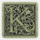 Charming decorative letter K initial monogram calligraphy style typography first letter in black over vintage sage green - avocado green book lining with off white Ginkgo biloba leaves.