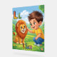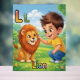 Cute and colorful alphabet poster featuring the letter L with a cheerful child and a friendly Lion illustration.