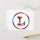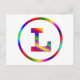 A colourful monogram with the letter L in rainbow colours inside of a rainbow circle. Share your pride of your name with a fun happy initial L.