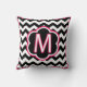 Letter M. Pretty monogram (single inital) throw pillow. Bold black and white zigzag (chevron) stripes, with white and fuchsia detailing and a single initial in the centre.