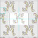 Pretty whimsical initial M hand drawn then converted to graphic letter art in grey with shades of yellow, purple, pink on a white background. Background colour can be changed to your own colour choice if required. Personalised with your own initial this fabric reads M, ideal for customised sewing projects. Other letters available. © Original drawing and design by Sarah Trett. www.sarahtrett.com for www.mylittleeden.com