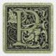 Charming decorative letter P initial monogram calligraphy style typography first letter in black over vintage sage green - avocado green book lining with off-white Ginkgo biloba leaves.
